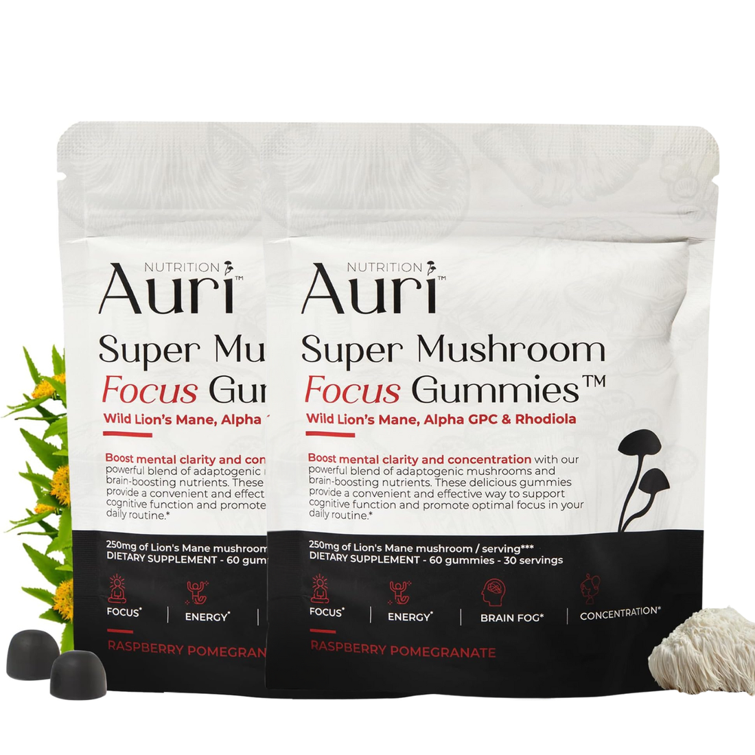 Auri Super Mushroom Focus Gummies to Support Cognitive, Mental Clarity, Focus & Energy - 2 Pack Of 60 Gummies